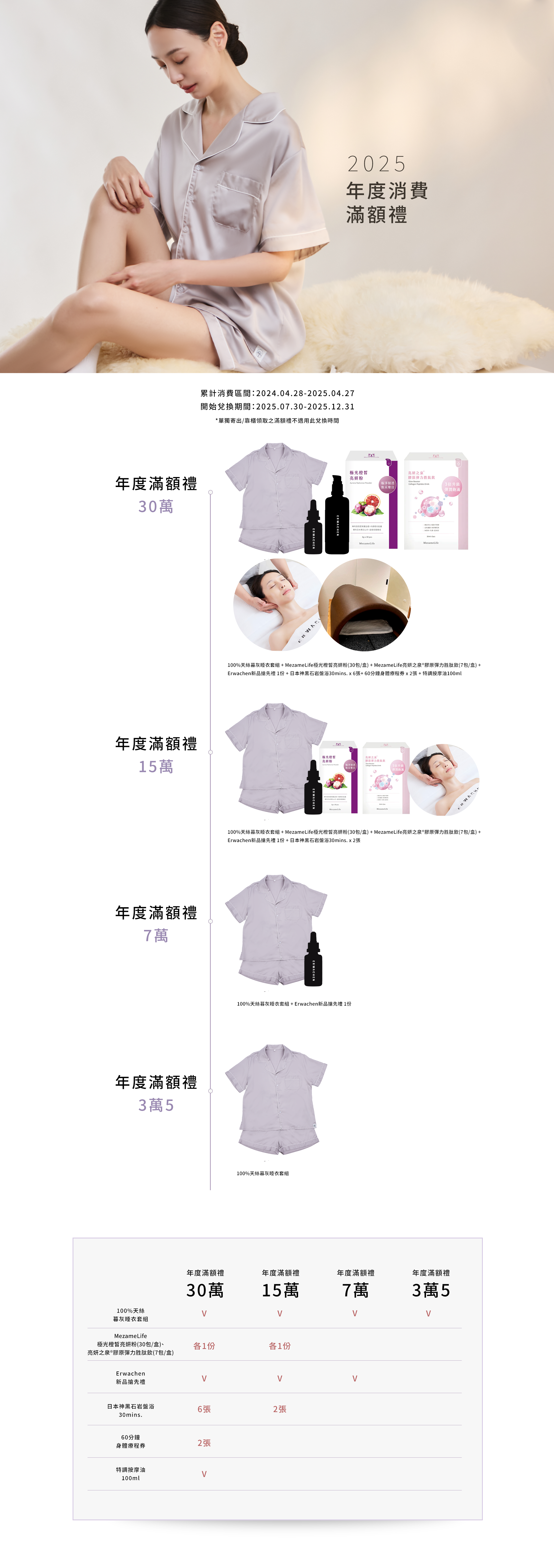今年爲了讓大家可以搶先體驗,於2025.02.28前年度消費滿額7萬以上的會員可依照以下方式搶先領取 天絲睡衣套組 與 Erwachen新品搶先禮1份 :